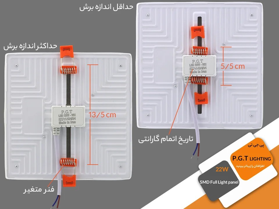 - ابعاد: پنل فول لایت 22 وات پی جی تی دارای ابعاد 170×170 میلیمتر است.